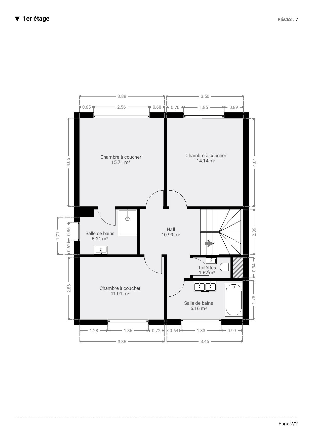 👉 Étage : hall de nuit, trois chambres, dont une avec salle de douche privative, salle de bains indépendante et WC séparé.